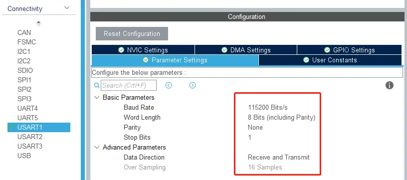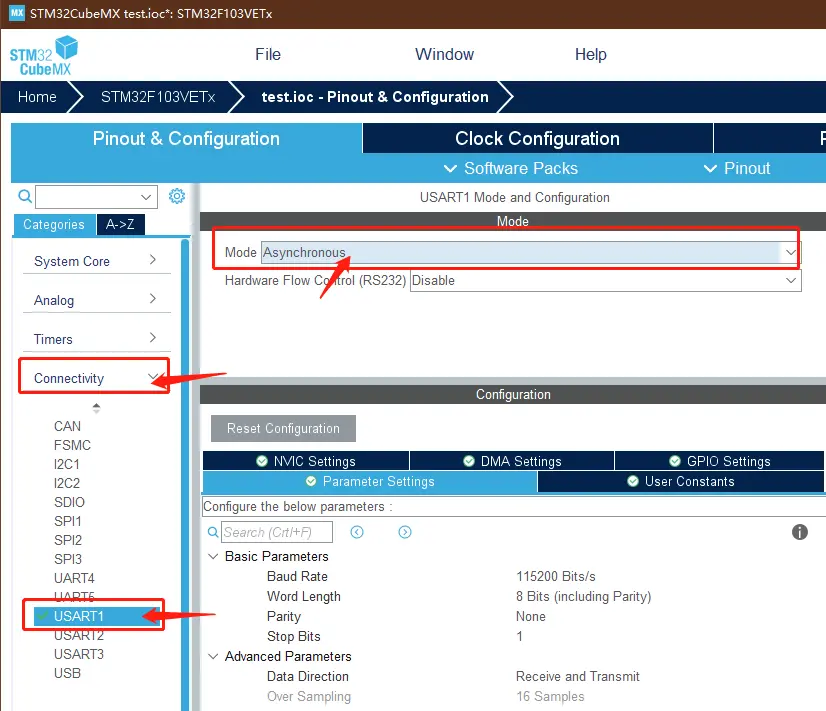 在 Connectivity 中选择 USART1 设置,并选择 Asynchronous 异步通信