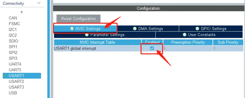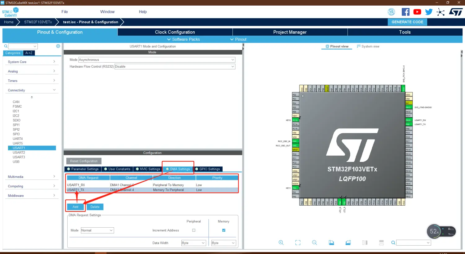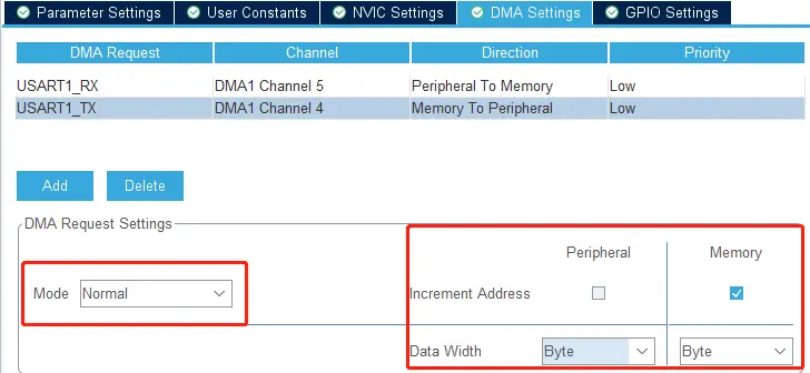 点击 DMA Settings 添加 USART1 TX 和 USART1 RX 分别对应DMA1 的通道4和通道5。