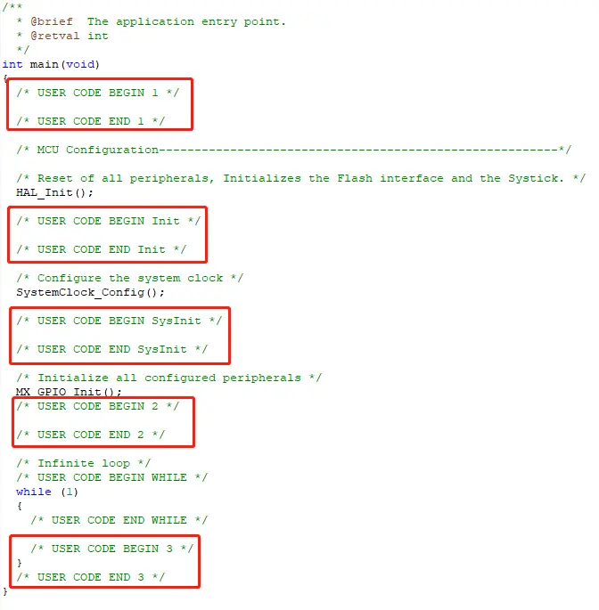 用户代码要加在 USER CODE BEGIN N 和 USER CODE END N 之间,否则下次使用 STM32CubeMX 重新生成代码后,会被删除。