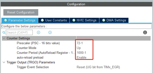 Counter Period(自动重装载值):1000-1 则定时时间 1/CK_CLK*(999+1) = 1ms