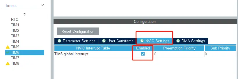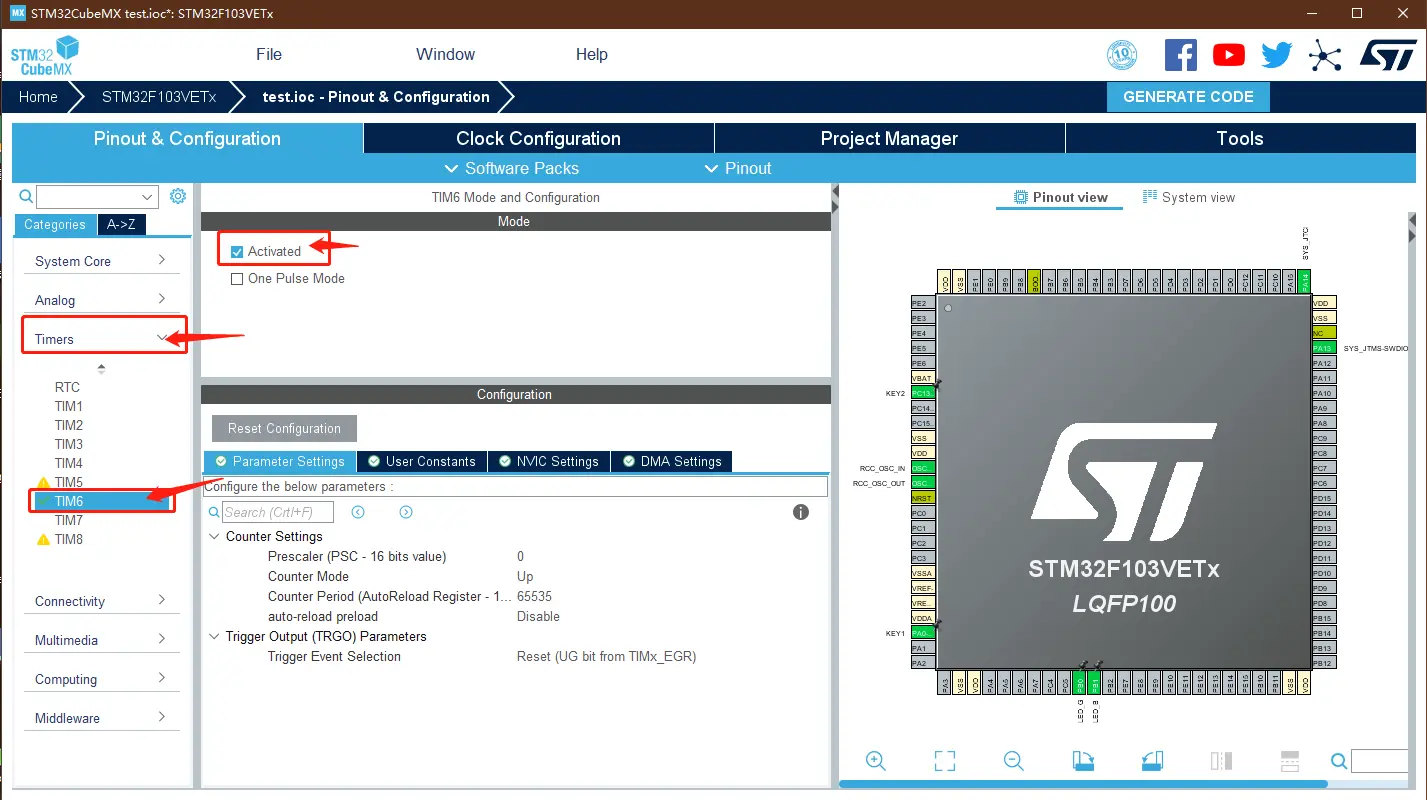 在 Timers 中选择 TIM6 设置,并勾选 Activated 激活