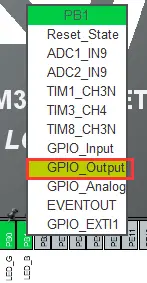 GPIO 设置,在右边图中找到 LED 灯对应引脚,选择 GPIO_Output,输出低电平点亮,可以添加自定义标签