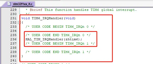 打开 stm32f1xx_it.c 中断服务函数文件,找到 TIM6 中断的服务函数 TIM6_IRQHandler()