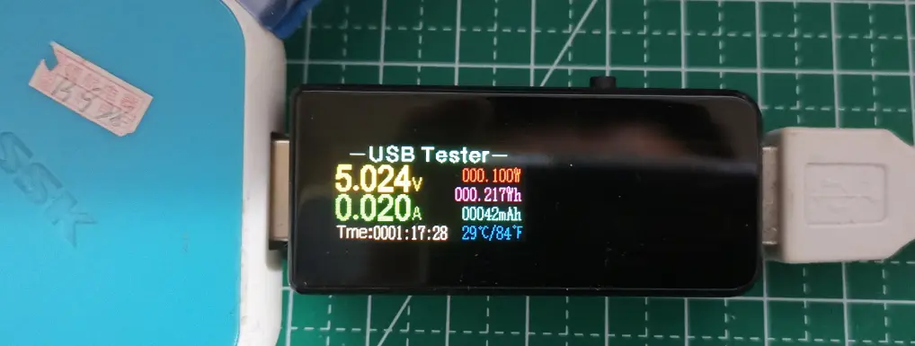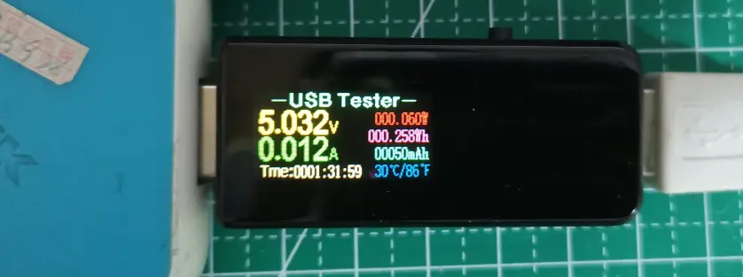 现在键盘的功能基本上搞完了,但是心里一直有一个疑惑:我写的程序一直循环检查按键状态,就算等待的时间,也是在原地循环,这样电路的功耗会不会很大?为了方便的搞清这个问题,采购了一个测量USB电流的小设备。这个工具主要是用来测量充电器的功率的,但是精确到了mA级,测量键盘的功率应该也是可以的。测量结果如下: