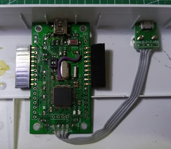但是很明显,这样有点丑,而且插的线偶尔会接触不良或脱落,导致一些按键失灵!看来为了把电路板塞到键盘壳子里,需要一个小一点的主控板了。