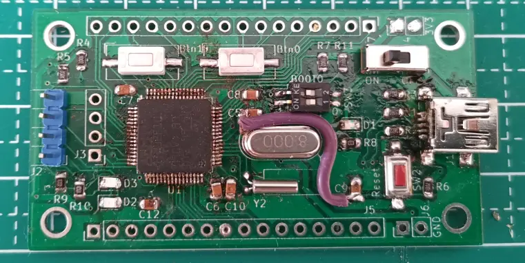 开工焊元件吧!结果发现自己动手能力已经严重退化了,镊子夹着元件抖得不行。还发现自己电路画错了,Reset键不灵,只好搞了个飞线,看一下最后效果,简直惨不忍睹…