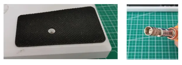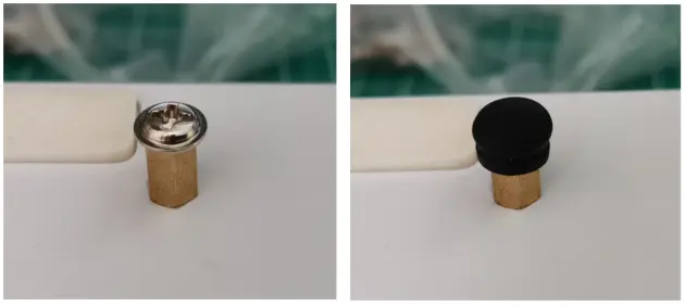 支脚网上有卖的,挺好看的,但是大都需要运费,就自己打了个孔,装了个六角铜柱,套上了一个小橡胶帽来防滑就可以了,橡胶帽是原来吃鸡手柄带的电容屏按键帽,防滑效果还是挺好的。