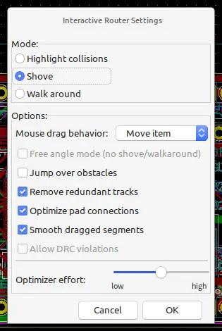 布线模式设置为推挤(shove),可以在步线时把之前的线推走,默认没有打开
