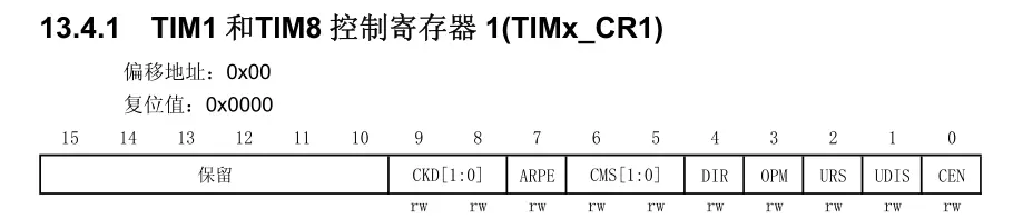 配置连续几位的方法也是一样的,就不介绍了。简单介绍配置不连续位的方法,以TIM1的CR1寄存器为例:
