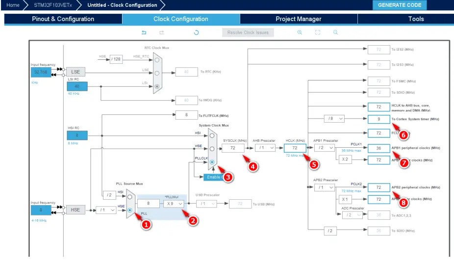 标号①:“PLL Source MUX(锁相环时钟源选择器)”的时钟源选择为“HSE”,即:8MHz外部晶体谐振器;