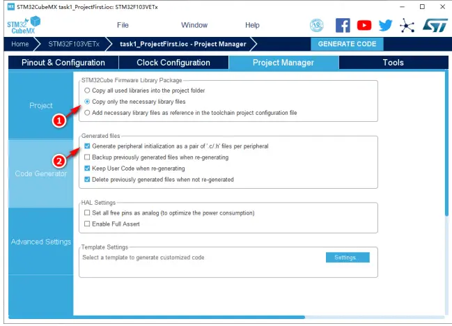 Package”单选框的选项改为“Copy only the necessary library files”,如图 9中的标号①所示。在“Generated files”复选框中增加勾选“Generate peripheral initializationas a pair of “.c/.h” files per peripheral”选项。如图 9 中标号②所示。点击左侧的“Project(工程)”配置标签进行“C 代码工程”保存的相关配置。由于之前已保存过 STM32CubeMX 的工程,因此“Project Name(工程名)”和“Project Location(工程存放位置)”处的信息已填好(分别如图 10 的标号①和标号②处所示)。