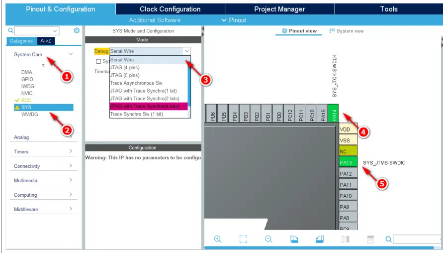 展开“Pinout & Configuration”标签页左侧的“System Core(系统内核)”选项(图 3中标号①处),选择“SYS(系统)”选项(图 3 中标号②处),将“Debug(调试)”下拉菜单改为“Serial Wire(串口线)”选项(图 3中标号③处)。即可将“PA13”引脚配置为 SWDIO 功能(图 3 中标号⑤处),“PA14”引脚配置为 SWCLK 功能(图 3 中标号④处)