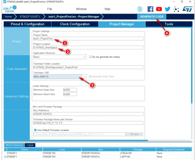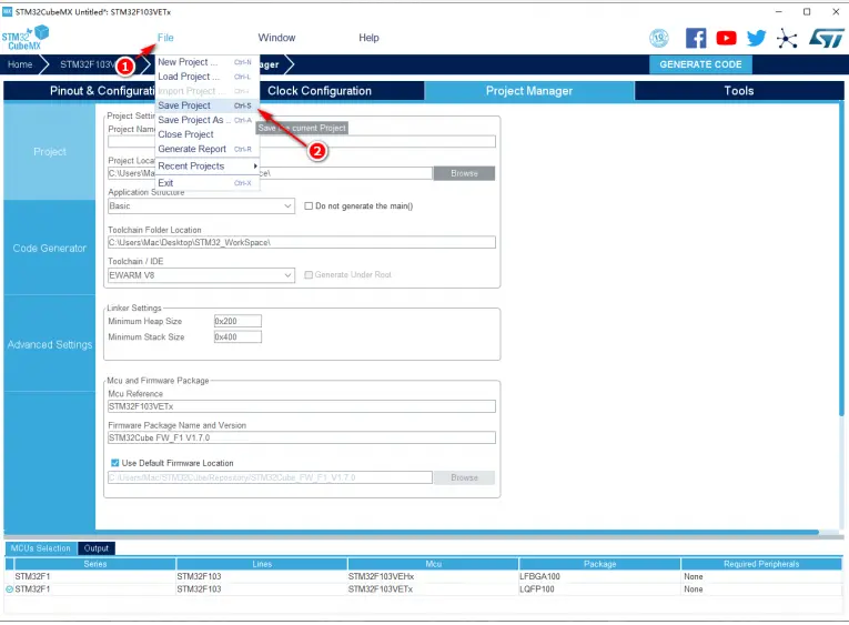 点击“File(文件)”菜单,选择“Save Project(保存工程)”选项,如图 8 中标号①和标号②所示。然后定位到文件夹“D:STM32_WorkSpacetask1_ProjectFirst”,点击“确定”保存 STM32CubeMX 工程;