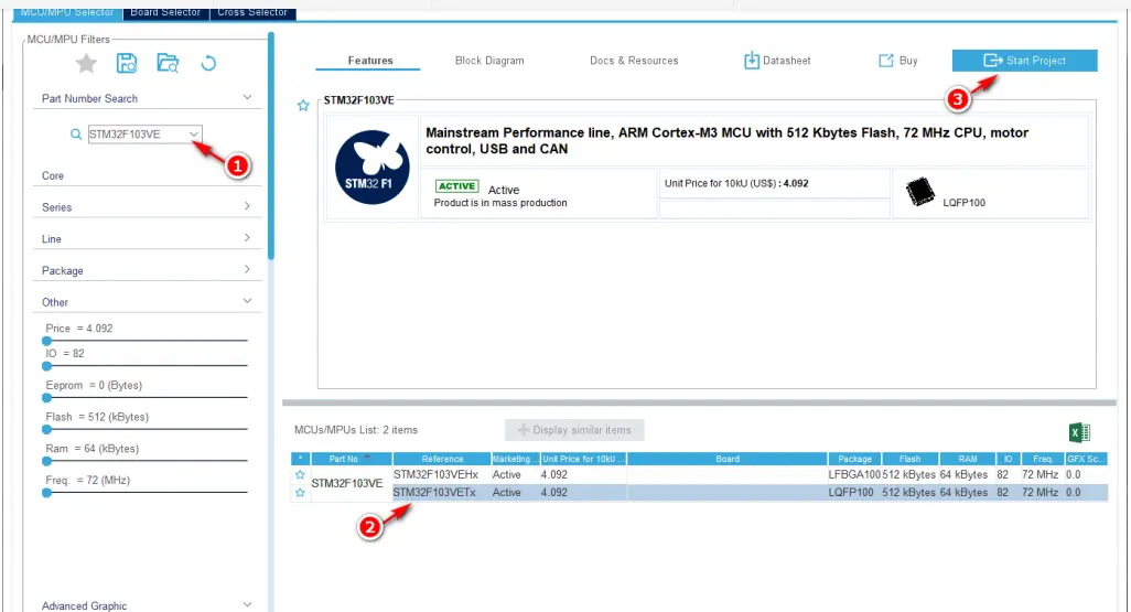 进入“MCU 选择”窗口,如图 2 所示。在图 2 中的标号①处,输入 MCU 型号的关键字,如:STM32F103VE。点击标号②处的MCU 型号,然后点击标号③处的“Start Project”按钮新建 STM32CubeMX 工程;