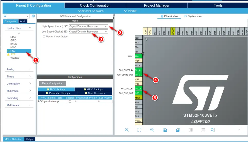 “Crystal/Ceramic Resonator(晶体/陶瓷谐振器)”,如图 4的标号②所示。同样地,将 MCU 的“Low Speed Clock(LSE,低速外部时钟)”配置为“Crystal/Ceramic Resonator(晶体/陶瓷谐振器)”,如图 4的标号③所示。配置完毕后,MCU 的“Pinout View(引脚视图)”中相应的引脚功能将被配置,如图 4中的标号④和⑤所示。