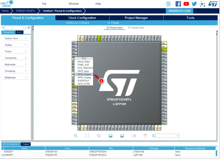 开发板的“PE6”引脚与 LED 灯——“LED2”相连。在 STM32CubeMX 工具的配置主界面,用鼠标左键点击 MCU 的“PE6”引脚处,选择功能“GPIO_Output”。如图 6所示。