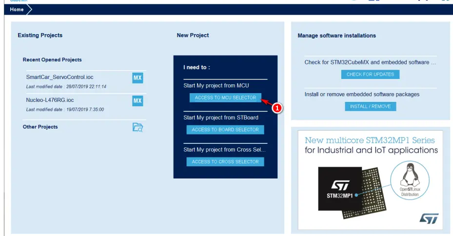 打开 STM32CubeMX 工具,点击“ACCESS TO MCU SELECTOR(选择 MCU)”按钮,如图图1所示;