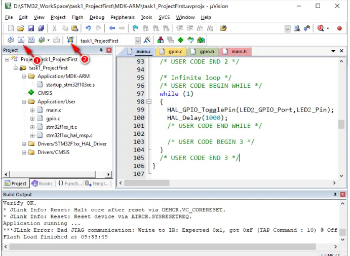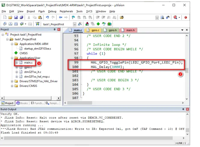 打开后的工程如图 12 所示,展开左侧的“工程列表”窗口,打开“main.c”文件(图 12 的标号①处),在 while(1)代码段中添加标号②处所示的两行代码。