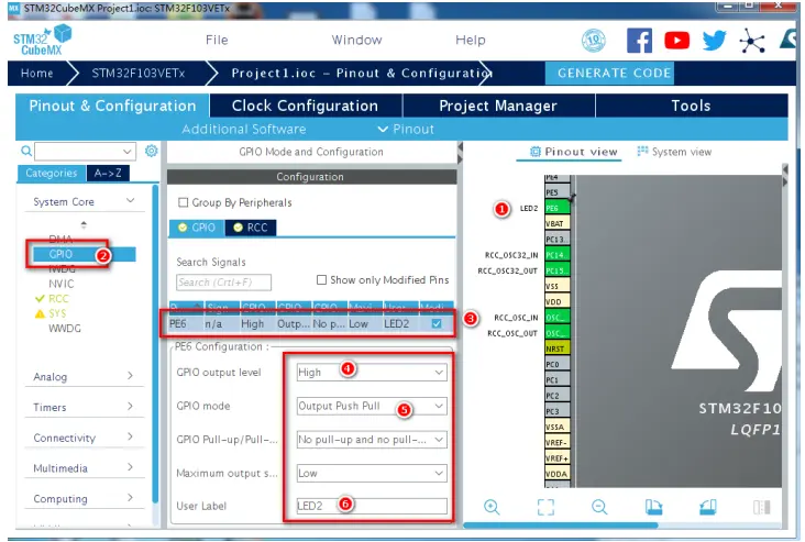 然后用鼠标右键点击“PE6”引脚,选择“Enter User Label”选项,输入值“LED2”,将“PE6”引脚的“用户标签”值配置为“LED2”,点击“GPIO”,选中“PE6”,确保 PE6 引脚的配置如图 7 中的④~⑥所示。