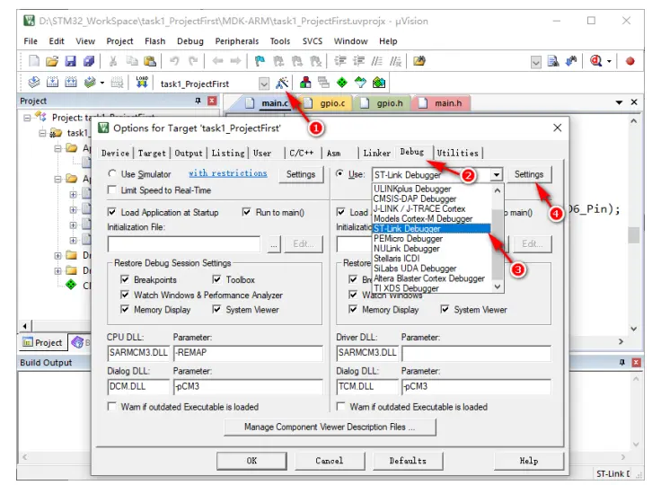 点击快捷工具栏中的魔术棒图标进行 C 代码工程的配置(图 13 中标号①处)。切换到“Debug”标签(图 13 中标号②处),选择相应的调试工具,如:ST-Link Debugger(图 13 中标号③处)。