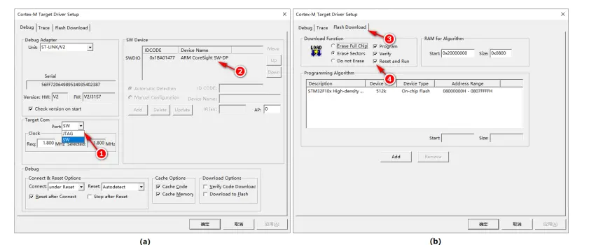 点击图 13 中的“Settings”按钮(标号④处)进入“调试与下载配置”界面,将调试工具端口改为“SW”,如图 14 子图(a)中标号①处所示。如果 STM32 微控制器连接正常,则会在右上角的“SW Device”窗口看到已连接的设备(图 14 子图(a)中标号②处)。点击“Flash Download”标签切换到“下载配置”界面(图 14 子图(b)中的标号③处),勾选“Reset and Run”选项(图 14 子图(b)中的标号④处)。经过这样的配置以后,程序下载到 STM32 开发板后会自动重启并运行。