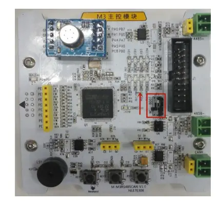 将 M3 主控模块板的 JP1 拨码开关拨向“boot”模式,如图16 M3 主控模块板烧写设置所示。可点击工具栏中的“Build(F7)”按钮进行工程的编译。编译无误后,点击工具栏中的“DownLoad(F8)”按钮进行工程的下载并运行。如图 16 中的标号①和标号②处所示。烧写完成后,再拨到NC模式,按复位键,观察LED灯;