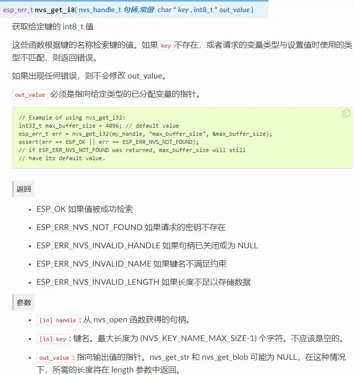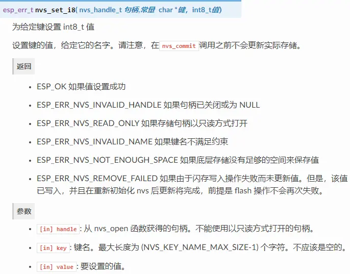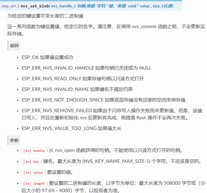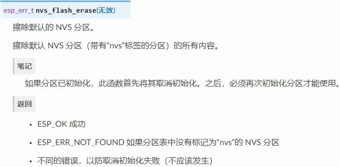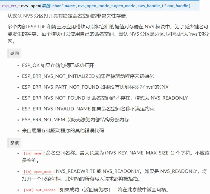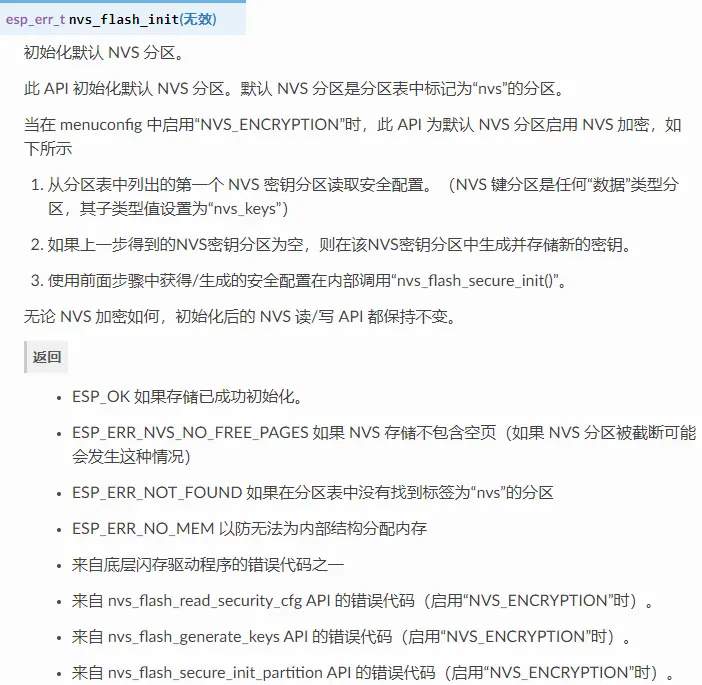 以下 NVS 接口位于 nvs_flash/include/nvs_flash.h。