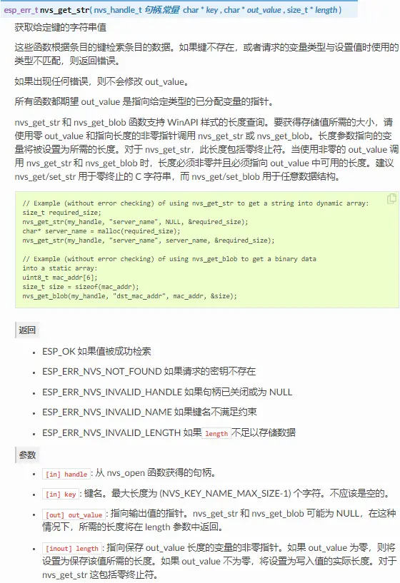 esp_err_t nvs_get_str (nvs_handle_t handle, const char* key, char* out_value, size_t* length);