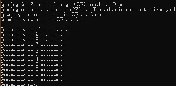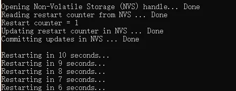 #include // Initialize NVS esp_err_t err = nvs_flash_init(); if (err == ESP_ERR_NVS_NO_FREE_PAGES || err == ESP_ERR_NVS_NEW_VERSION_FOUND) { // NVS partition was truncated and needs to be erased // Retry nvs_flash_init ESP_ERROR_CHECK(nvs_flash_erase()); err = nvs_flash_init(); } ESP_ERROR_CHECK( err ); // Open printf('n'); printf('Opening Non-Volatile Storage (NVS) handle... '); nvs_handle_t my_handle; err = nvs_open('storage', NVS_READWRITE, &my_handle); if (err != ESP_OK) { printf('Error (%s) opening NVS handle!n', esp_err_to_name(err)); } else { printf('Donen'); // Read printf('Reading restart counter from NVS ... '); int32_t restart_counter = 0; // value will default to 0, if not set yet in NVS err = nvs_get_i32(my_handle, 'restart_counter', &restart_counter); switch (err) { case ESP_OK: printf('Donen'); printf('Restart counter = %dn', restart_counter); break; case ESP_ERR_NVS_NOT_FOUND: printf('The value is not initialized yet!n'); break; default : printf('Error (%s) reading!n', esp_err_to_name(err)); } // Write printf('Updating restart counter in NVS ... '); restart_counter++; err = nvs_set_i32(my_handle, 'restart_counter', restart_counter); printf((err != ESP_OK) ? 'Failed!n' : 'Donen'); // Commit written value. // After setting any values, nvs_commit() must be called to ensure changes are written // to flash storage. Implementations may write to storage at other times, // but this is not guaranteed. printf('Committing updates in NVS ... '); err = nvs_commit(my_handle); printf((err != ESP_OK) ? 'Failed!n' : 'Donen'); // Close nvs_close(my_handle); } printf('n'); // Restart module for (int i = 10; i >= 0; i--) { printf('Restarting in %d seconds...n', i); vTaskDelay(1000 / portTICK_PERIOD_MS); } printf('Restarting now.n'); fflush(stdout); esp_restart();} 查看打印: 4.2 字符串及数组读写 初始化后 #include 'nvs_flash.h'void main(void){ ... ESP_ERROR_CHECK(nvs_flash_init()); ...} 写入 void NvsWriteDataToFlash(void){ nvs_handle handle; // 写入一个整形数据,一个字符串,WIFI信息以及版本信息 static const char *NVS_CUSTOMER = 'customer data'; static const char *DATA2 = 'String'; static const char *DATA3 = 'blob_wifi'; static const char *DATA4 = 'blob_version'; // 要写入的字符串 char str_for_store[32] = 'i am a string.'; // 要写入的WIFI信息 wifi_config_t wifi_config_to_store = { .sta = { .ssid = 'store_ssid:hello_kitty', .password = 'store_password:1234567890', }, }; // 要写入的版本号 uint8_t version_for_store[4] = {0x01, 0x01, 0x01, 0x00}; printf('set size:%urn', sizeof(wifi_config_to_store)); ESP_ERROR_CHECK( nvs_open( NVS_CUSTOMER, NVS_READWRITE, &handle) ); ESP_ERROR_CHECK( nvs_set_str( handle, DATA2, str_for_store) ); ESP_ERROR_CHECK( nvs_set_blob( handle, DATA3, &wifi_config_to_store, sizeof(wifi_config_to_store)) ); ESP_ERROR_CHECK( nvs_set_blob( handle, DATA4, version_for_store, 4) ); ESP_ERROR_CHECK( nvs_commit(handle) ); nvs_close(handle);} 读出 void NvsReadDataFromFlash(void){ esp_err_t err; nvs_handle handle; static const char *NVS_CUSTOMER = 'customer data'; static const char *DATA2 = 'String'; static const char *DATA3 = 'blob_wifi'; static const char *DATA4 = 'blob_version'; uint32_t str_length = 32; char str_data[32] = {0}; wifi_config_t wifi_config_stored; uint8_t version[4] = {0}; uint32_t version_len = 4; memset(&wifi_config_stored, 0x0, sizeof(wifi_config_stored)); uint32_t wifi_len = sizeof(wifi_config_stored); ESP_ERROR_CHECK( nvs_open(NVS_CUSTOMER, NVS_READWRITE, &handle) ); ESP_ERROR_CHECK ( nvs_get_str(handle, DATA2, str_data, &str_length) ); ESP_ERROR_CHECK ( nvs_get_blob(handle, DATA3, &wifi_config_stored, &wifi_len) ); ESP_ERROR_CHECK ( nvs_get_blob(handle, DATA4, version, &version_len) ); printf('[data1]: %s len:%urn', str_data, str_length); printf('[data2]: %drn', value); printf('[data3]: ssid:%s passwd:%srn', wifi_config_stored.sta.ssid, wifi_config_stored.sta.password); nvs_close(handle);}