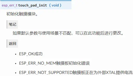 在使用触摸板之前,您需要通过调用函数来初始化触摸板驱动程序touch_pad_init()。此函数设置“ API参考”中“宏”.._DEFAULT下列出的几个驱动程序参数。它还会删除有关之前曾经触摸过哪些打击垫的信息(如果有的话),并禁用中断。