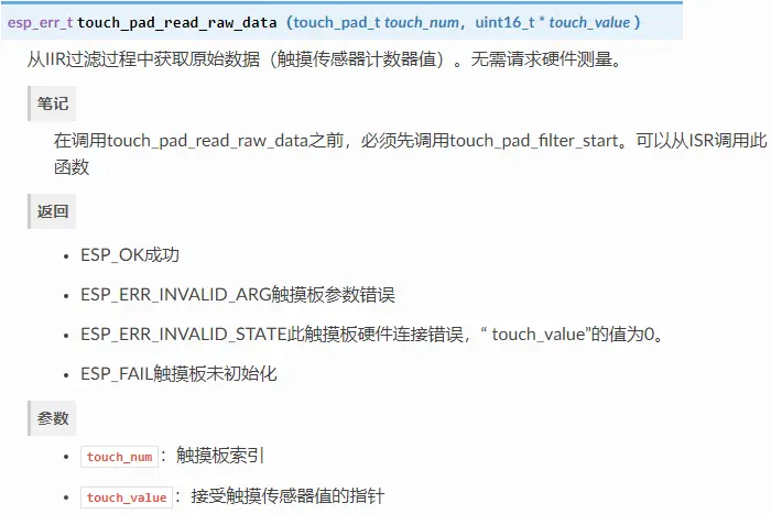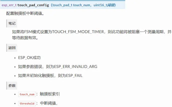 以下 Touch Sensor 接口位于 driver/include/driver/touch_pad.h 和 driver/include/driver/touch_sensor_common.h。