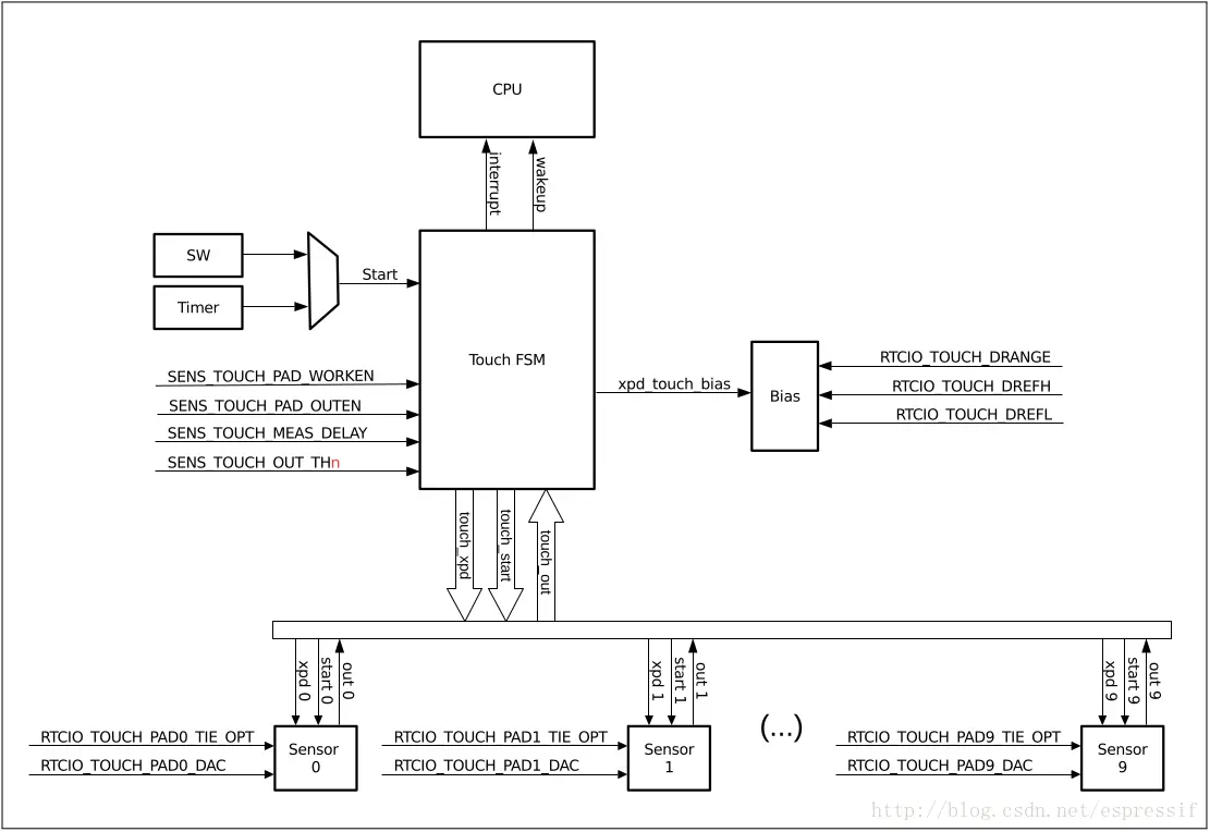 使用该功能touch_pad_set_fsm_mode()选择是否应通过硬件计时器或软件自动启动触摸板测量(由FSM操作)。如果选择了软件模式,请使用touch_pad_sw_start()来启动FSM。