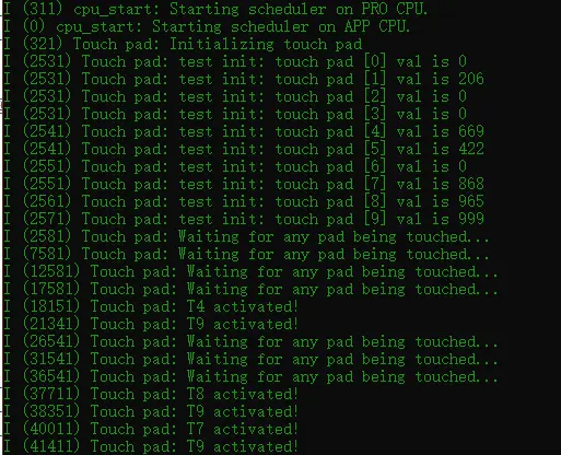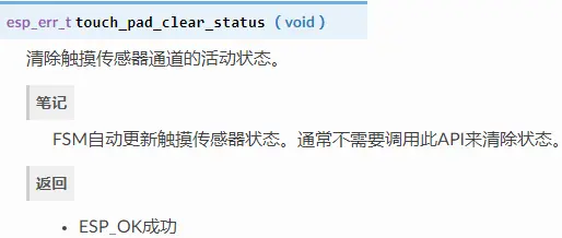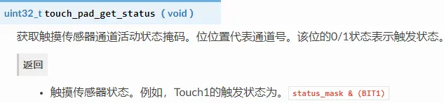 当中断可操作时,您可以通过调用touch_pad_get_status()并从中清除中断的状态来获取信息touch_pad_clear_status()。
