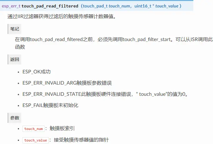 如果测量结果比较嘈杂,则可以使用提供的API函数对其进行过滤。在使用过滤器之前,请调用进行启动touch_pad_filter_start()。
