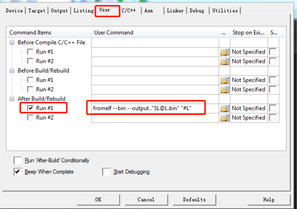 2、最下方的Run #1打上勾,后面文本框里输入:fromelf --bin --output .'SL@L.bin' '#L',然后点击OK