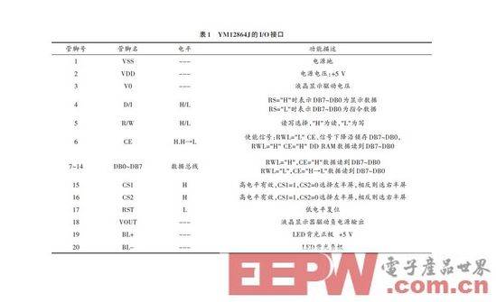片内未被使用的资源仍然同样可以被配置成为其他的模块使用,从而实现系统的SOC集成。 2 液晶屏控制器的选择 这里使用的是一块YM12864J的液晶显示模块,它已集成了SED1330作为液晶显示屏的控制器,与同类产品相比其主要特点有: (1)有较强功能的I/O控制器; (2)指令简单; (3)8位并行I/O口; (4)文本和图形方式混合显示。 YM12864J的I/O接口见表1. 3 FPGA 与LCD 的接口电路 本设计选择的液晶显示屏已经和控制器集成在了一起,外围电路就比较简单,只有FPGA