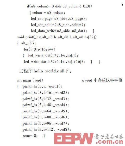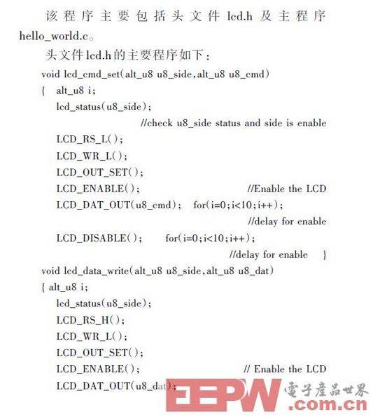 将数据直接送至SED1330显示缓冲区,应用层函数会对液晶的控制器发送控制命令和显示数据,然后液晶屏就会显示用户想要显示的内容,本设计应用层设计了一些基本的显示函数,可以显示字符,汉字和简单的图形,用户只需调用一些显示函数就可以显示内容,系统的软件设计流程如图3所示。 初始化函数的作用对液晶显示器的控制器发送初始化命令。发送指令的方法如下:根据I/O的配置,先将命令数据送到与SED1330 控制器的命令口相连的I/O口,然后把该命令的参数依次送到数据口地址。初始化代码如下: 该程序主要包括头文件LCD.h 及主程序hello_world.c. 头文件lcd.h的主要程序如下: 当所有代码设计完成并仿真调试成功后,在QUARTus Ⅱ软件中将完整的项目进行编译,也就是将硬件配置信息与代码软件信息编译在一起,并通过并口电缆最终下载到EP2C8T144C8芯片中,得到系统显示结果信息清晰,稳定。 5 结语 本文利用SOPC技术实现了基于NiosⅡ嵌入式处理器的LCD 显示系统的设计方案,从方案的设计中可以看出采用NiosⅡ嵌入式软核处理器与使用NiosⅡIDE 集成开发环境进行软硬件开发的灵活性和优越性,且本文方案中的设计思路与实例开发对解决不同型号液晶屏之间的驱动具有通用性。