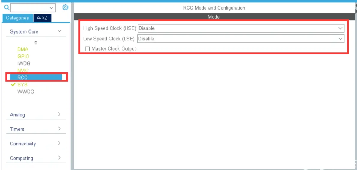 HSE与LSE分别为外部高速时钟和低速时钟,在本文中使用内置的时钟源,故都选择Disable选项,如下所示: