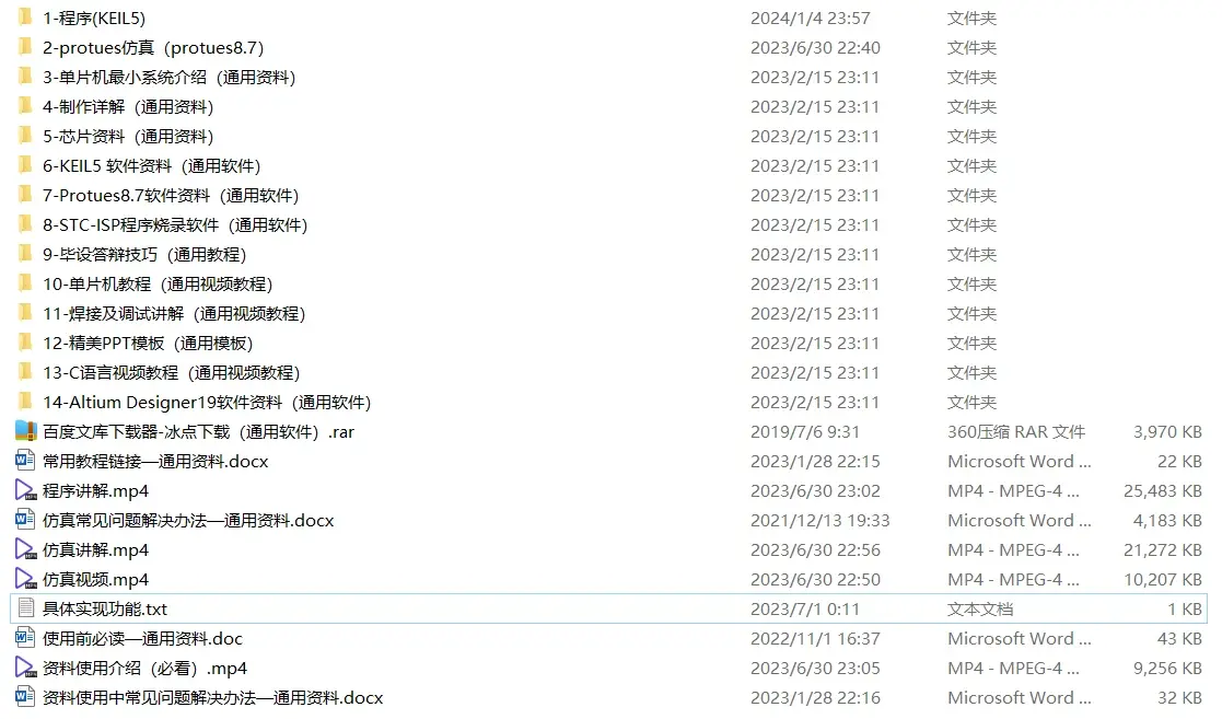 全部资料包括程序(keil5)、protues仿真(protues8.7)、开发资料、资料使用介绍、仿真视频、程序讲解视频、仿真讲解视频、最小系统介绍视频等。