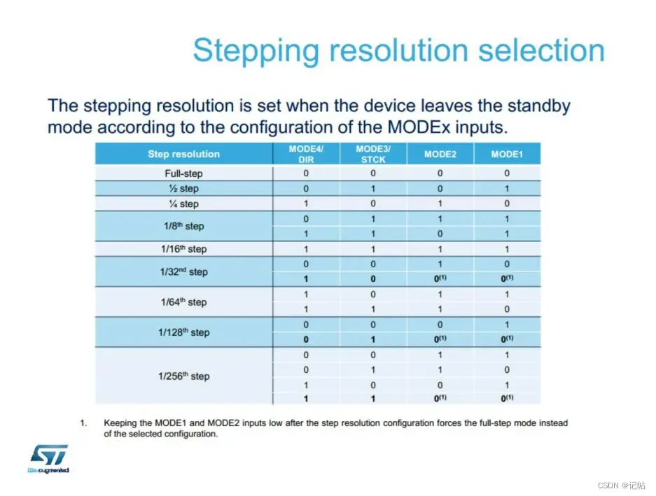 下图为设置细分示意图。STBY是STSPIN220驱动器中的一种状态,表示待机状态(Standby)。在待机状态下,驱动器可能会降低功耗,停止执行步进操作,以便在不需要进行步进电机运动时节省能源。当驱动器从待机状态退出时,会获取MODE输入的值。需要注意的是MODE1和MODE2都为低电平时候强制为全步模式。