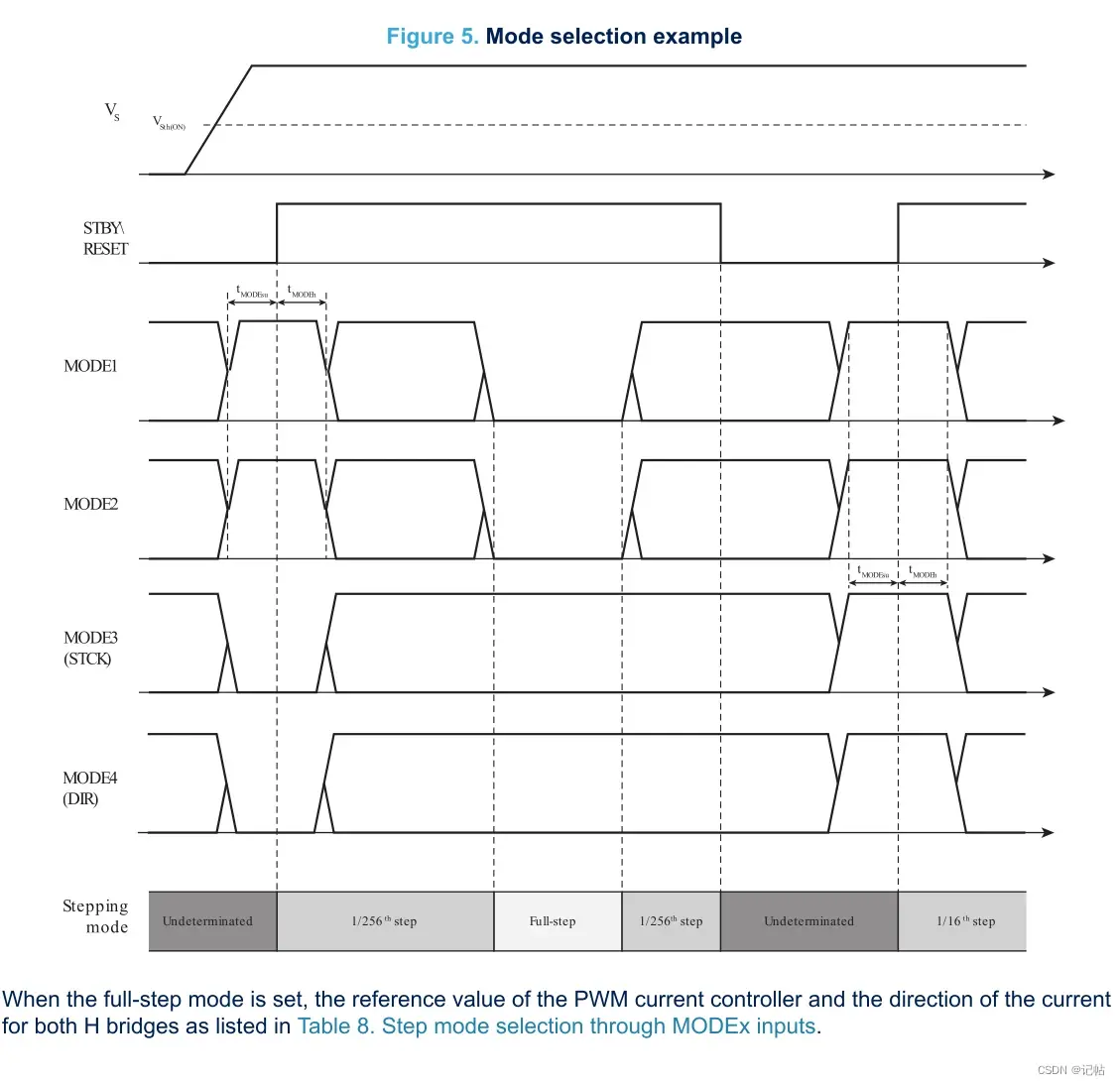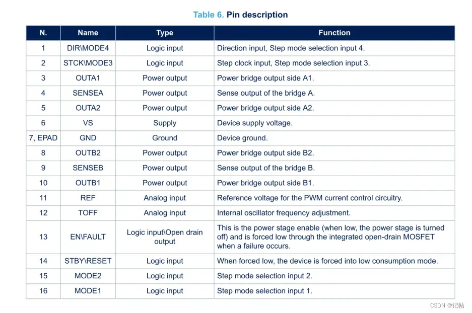 设置MODEx输入:根据目标步进分辨率(可以参考Table 1),设置MODEx输入引脚的状态。这些引脚决定了步进电机的微步运动模式。