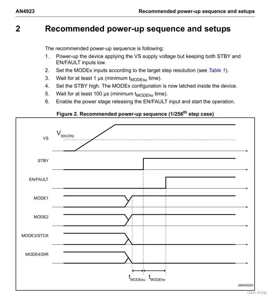 启用电源级:释放EN/FAULT输入,使电源级开始工作。这意味着驱动器已经准备好执行步进操作。 通过按照这个推荐的上电顺序和设置过程,您可以确保在驱动器开始工作之前,各个输入的状态都稳定,并且微步模式配置正确地被锁存,从而实现步进电机的精确控制。这个过程有助于减少潜在的启动问题和不稳定性。