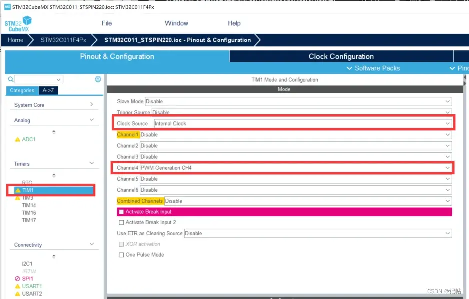 STM32CUBEMX中,选择定时器1,并将其配置为PWM输出模式。确保选择了正确的定时器通道(通道4)。