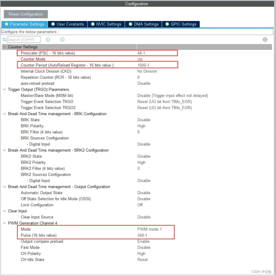 在上述配置中,将定时器1的预分频系数设置为48-1,自动重载值设置为1000-1。根据这些配置,PWM的频率可以计算为48,000,000 / ((48-1+1) * (1000-1+1)) = 1000Hz,即1kHz。