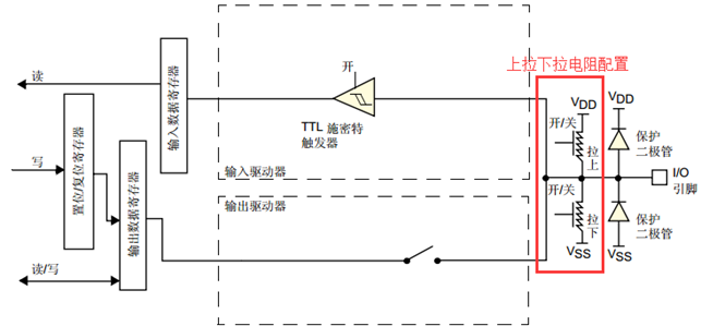 下拉输入:CPU内部的下拉电阻使能、上拉电阻断开的输入模式。