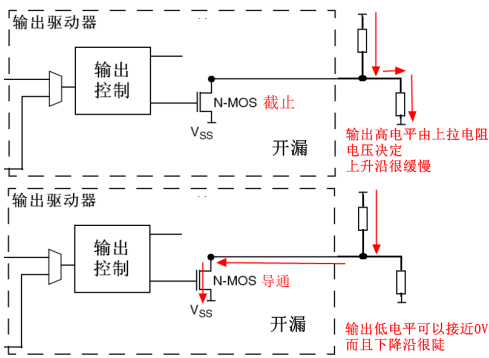 开漏输出提供了灵活的输出方式,但是也有其弱点,就是带来上升沿的延时。因为上升沿是通过外接上拉无源电阻对负载充电,所以当电阻选择小时延时就小,但功耗大;反之延时大功耗小。所以如果对延时有要求,则建议用下降沿输出。