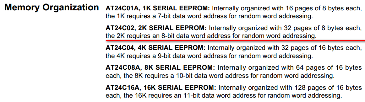 AT24C02的存储容量为2K bit,内容分成32页,每页8Byte,共256Byte,操作时有两种寻址方式:芯片寻址和片内子地址寻址。