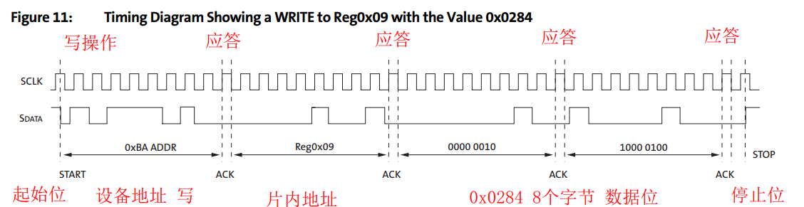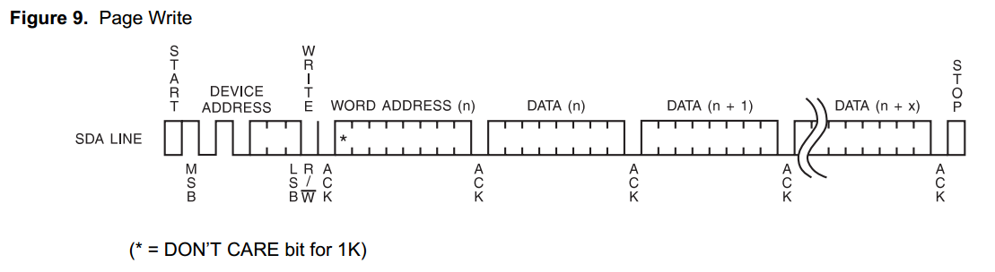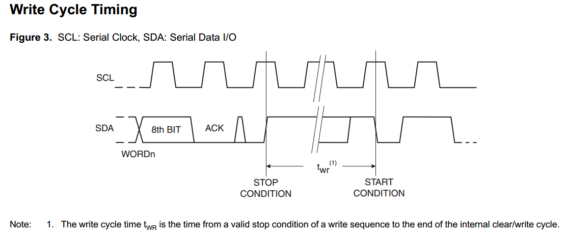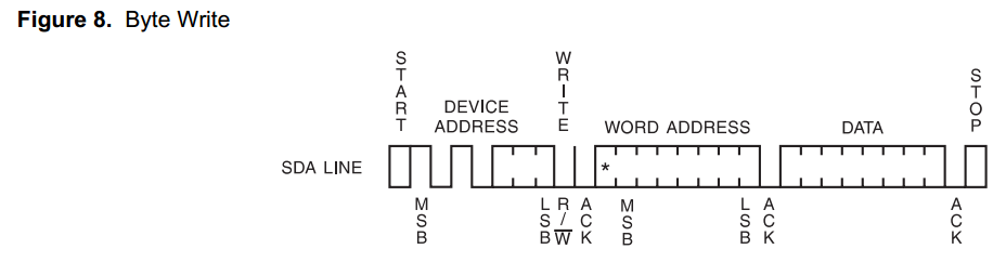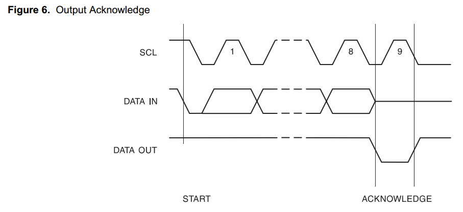 所有地址和数据字串行传输EEPROM中的8位字。 EEPROM发送一个低电平来确认它有收到每一个字。这发生在第九个时钟周期。
