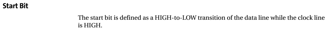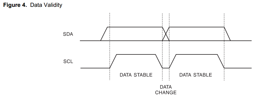 SDA引脚通常通过外部设备拉高。SDA引脚上的数据只能在SCL低电平期间改变,SCL高电平期间的数据变化将指示开始或停止。