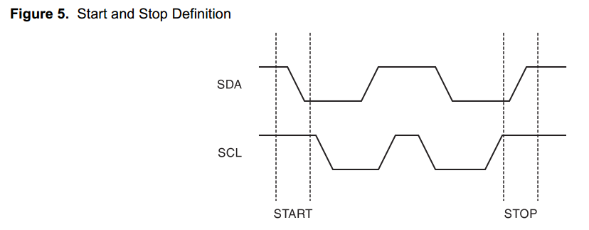 开始条件:SCL为高电平的SDA从高电平变为低电平是一个开始条件,这必须在任何其他命令之前。